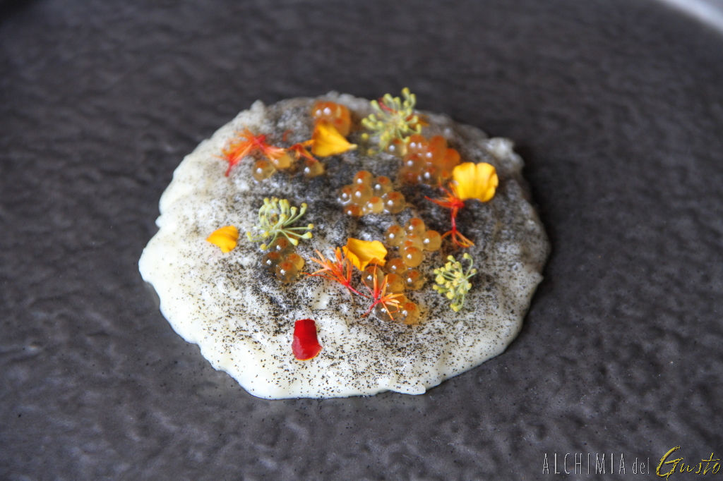 Risotto, caprino, uova di pesce, ginepro