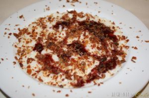 Il riso lo porto io: Riso mantecato, porto rosso e polvere di prosciutto crudo