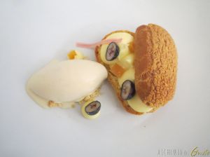 Bignè pugliese, crema di limone del Gargano e burro podolico (Stella Dicecca), mirtilli, gelato alla mandorla di Toritto (presidio Slow Food)
