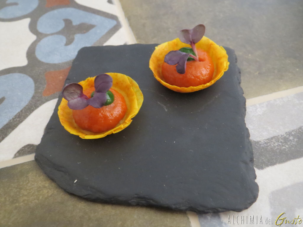 Piccole entrèe: :Tartelletta di pasta fillo alla cuccuma crema di pomodoro