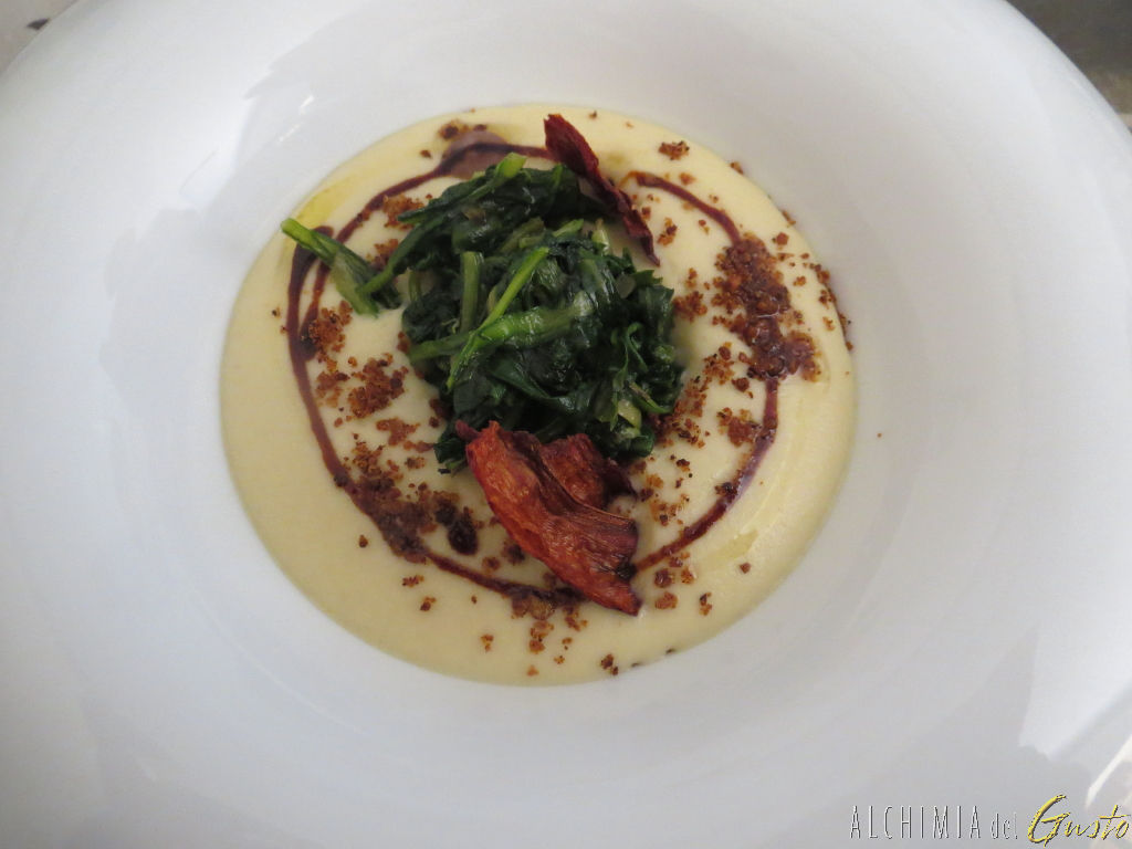 Spuma di fave di Carpino (presidio Slow Food), cicorietta, peperone crusco , crema di olive nere di Cerignola e vincotto di fichi