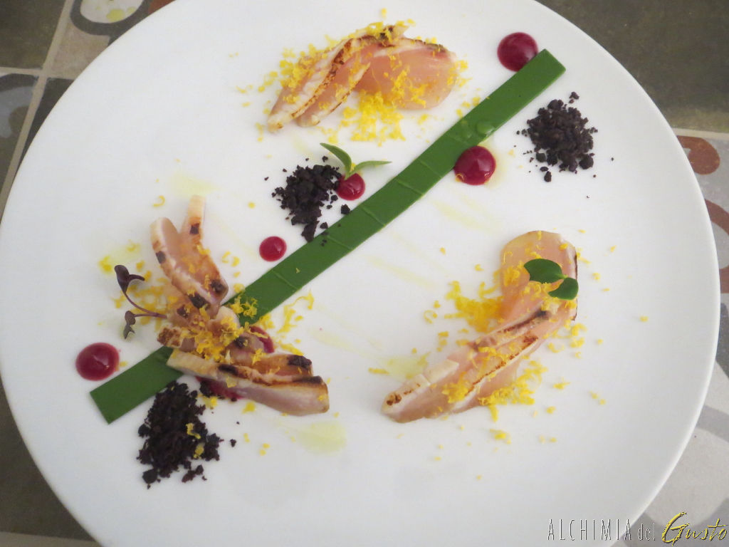 Ricciola leggermente scottata, bavarese di cicorie, melograno, polvere di olive nere di Cerignola e bottarga di gallina