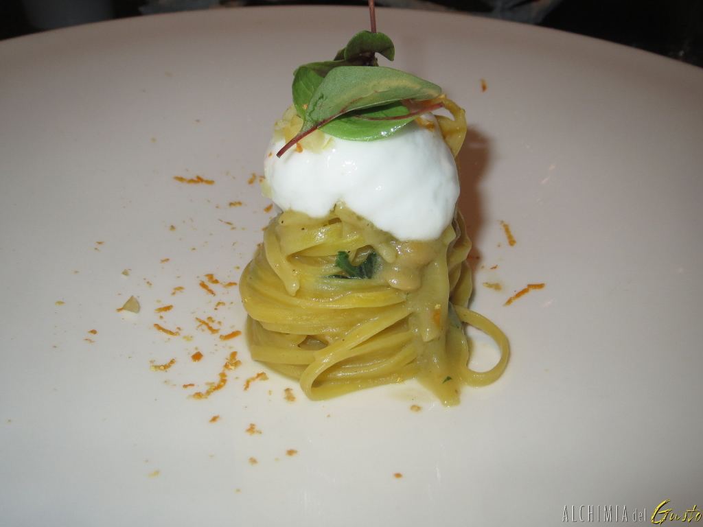 Tagliolino con baccala, acqua di ceci e limone salato