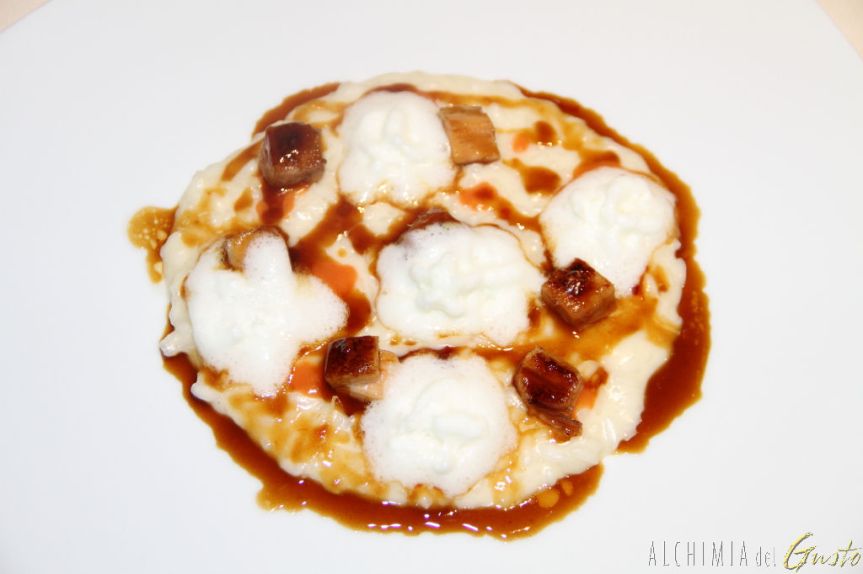 5) “Risotto al barbecue, accompagnato dal maialino e la sua salsa, spuma di mozzarella e coulis di pomodoro”
