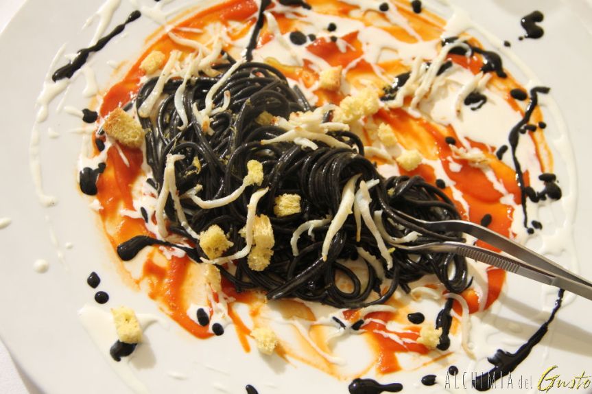 8) “Spaghetto al nero, burrata, calamaretti, crema di pomodorino e dadolata di pane alla brace”