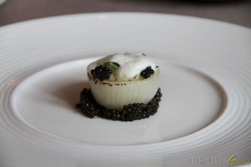 9) “Cipolla arrostita tartare di cipolla e caviale e latte cagliato”