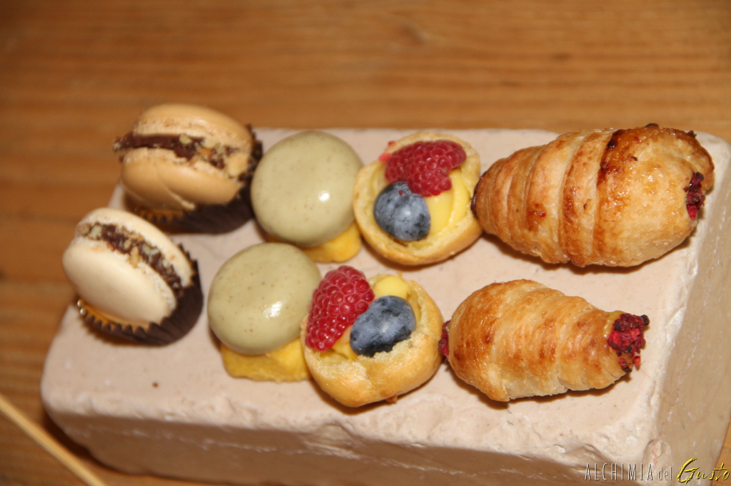 Ultime coccole finali: cannocino al cioccolato, bignè con crema e frutti di bosco, ananas e pistacchio, macarons cioccolato e granella di pistacchio