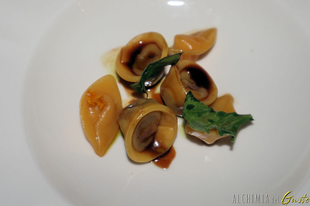 I primi piatti: Tortelli ripieni di manzetta brasata e clementine, fondo bruno al cioccolato ed erbe selvatiche.