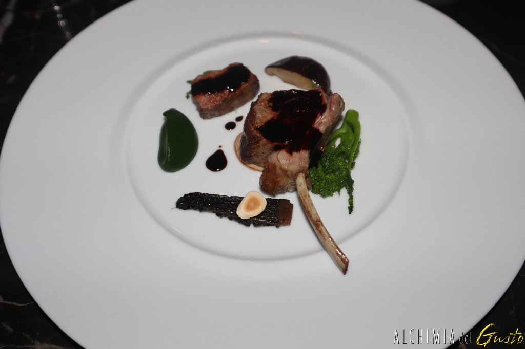 Siamo ai I secondi: Sella di agnello, aglio nero, funghi, erbe amare e nocciole tostate