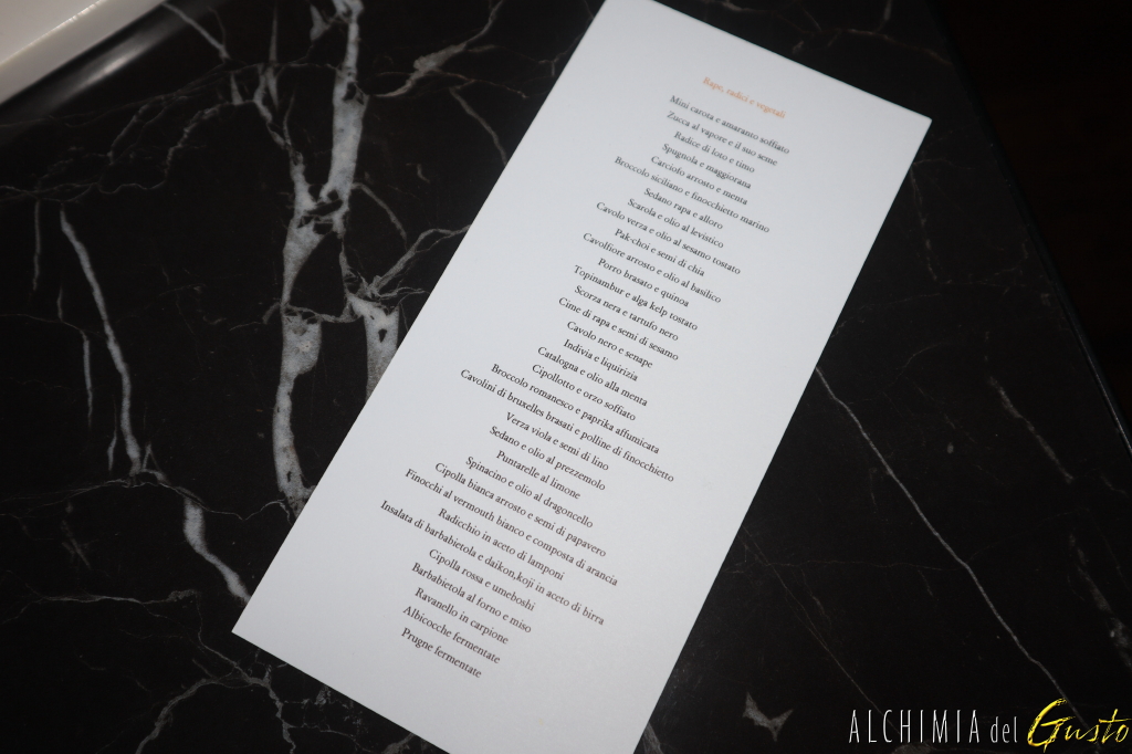 Una preparazione storica dello chef. Divertente e stimolante. Sembra di gustare una serie di piccoli piattini, esattamente 34, poiché ognuno di essi ha una sua idea.