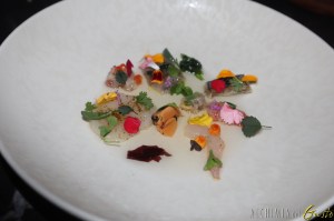 Si passa agli antipasti: Il mare e i suoi frutti in infuso dashi (gambero rosa, cicala/canocchia, scampo, tartare di ombrina, capasanta, cozza, vongole e sgombro.