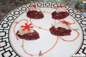 Scampo, tartare di capriolo, arachidi e rabarbaro