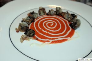 Spiedo di lumache all’Amatriciana (Lumache di vigna cotte alla brace ed avvolte con guanciale d’Amatrice su crema di pecorino)
