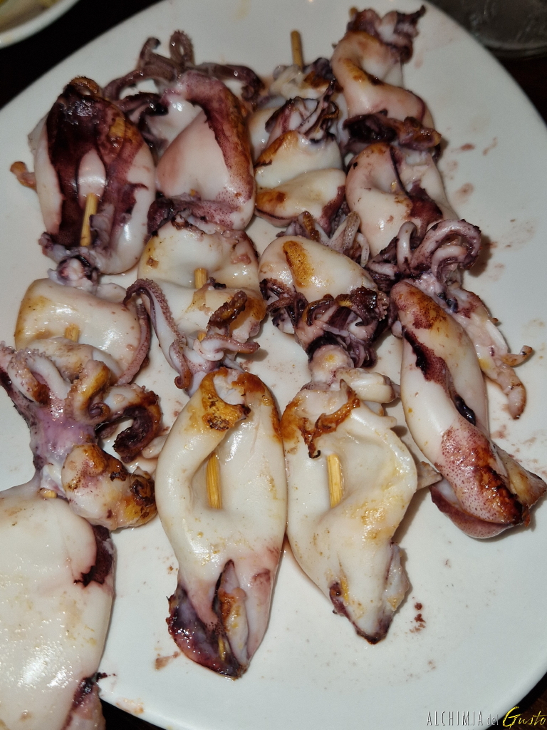 Dei golosissimi spiedini di calamaretti tra il crudo ed il cotto.