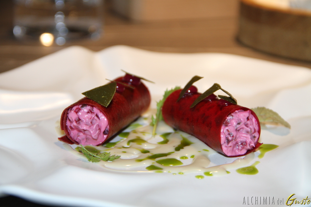 Cannolo di barbabietola ripieno della sua insalata russa alla mediterranea, salsa di Crosta Fiorita € 20,00