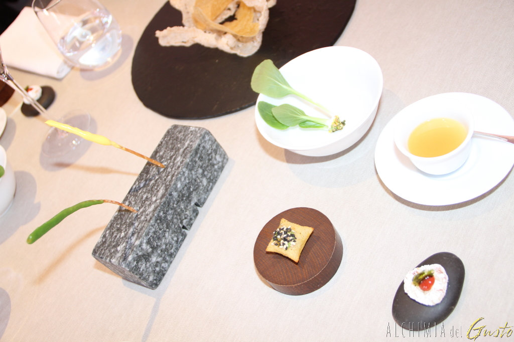 Sorbetto allo shiso e mela verde, amaretto e umeboshi, tacos di mais e maionese alle erbe