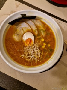 Miso Ramen: Brodo denso a base di pollo e pesto di miso saporito, servito con carne di maiale, uovo, germogli di soia, mais, cipollotti, nori.