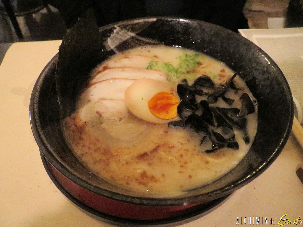 Tonkotsu Ramen: Brodo denso a base di maiale, servito con carne di maiale, uova, funghi kikurage, Takana (foglie di senape in salamoia), uovo, cipollotti, nori.