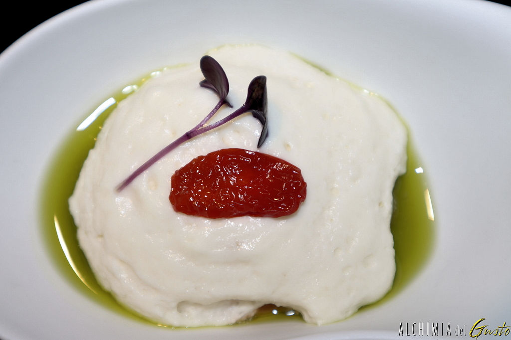 Parmigiana rivisitata: ; crema di melanzana affumicata, olio al basilico, spuma di pecorino e pomodorini confit
