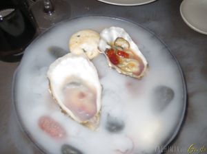 Ostriche Kei servite con gelatina di tosazu, spuma di ponzu, battuta di cipolla rossa e pomodoro datterino