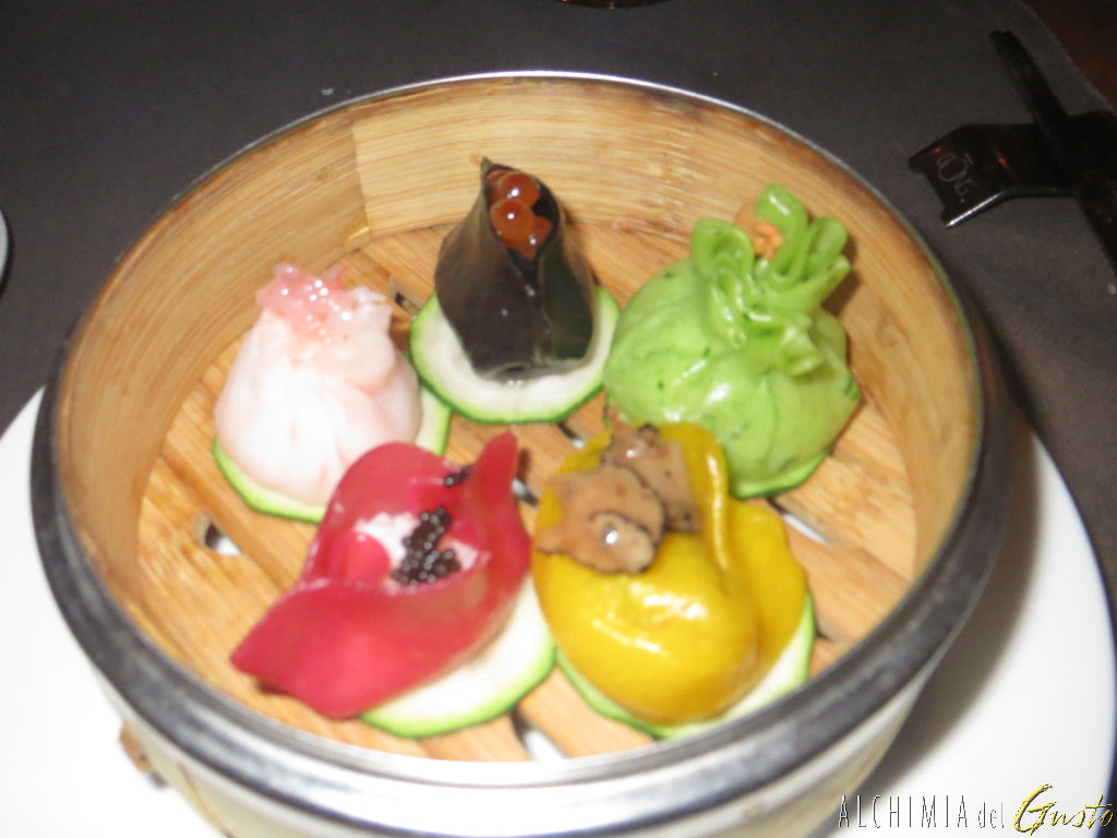 Misto di ravioli al vapore con zafferano, nero di seppia, verdure, barbabietola rossa e gamberi