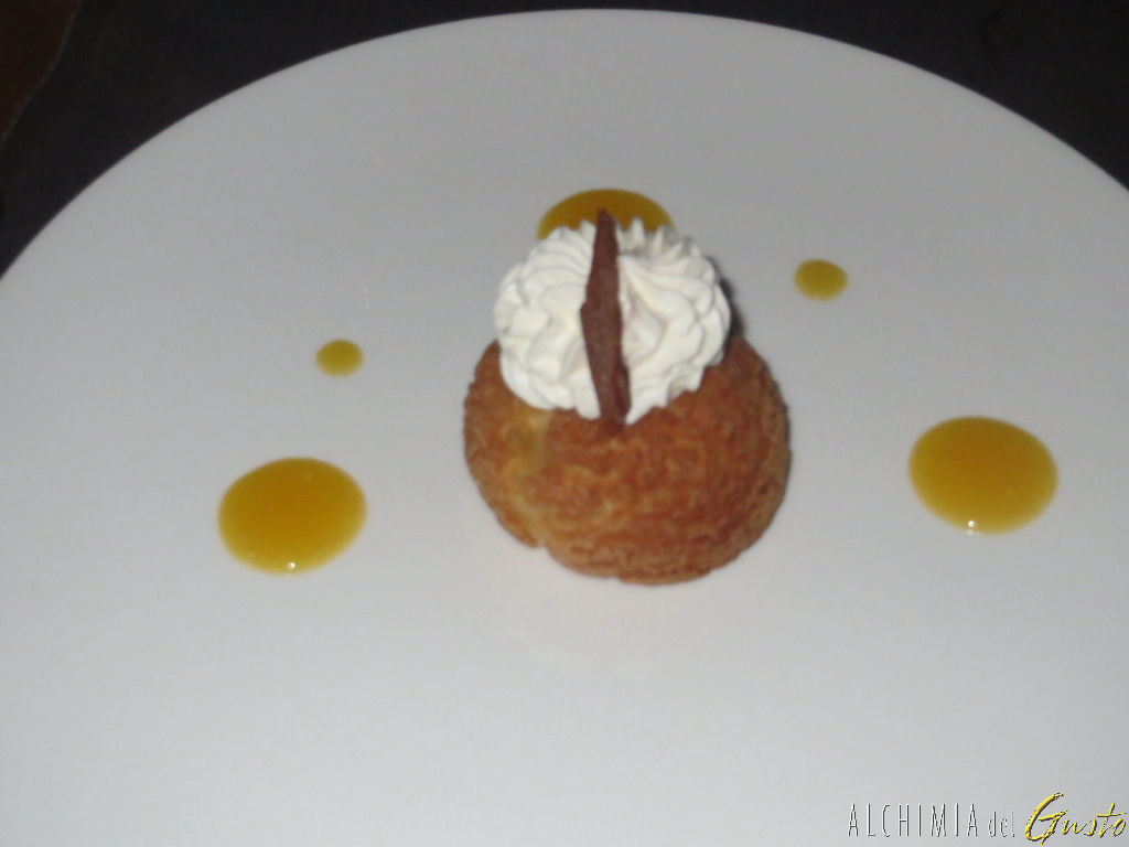Dolce passione: Bignè ripieno di cioccolato biondo al biscotto tostato, croccante e cialda al frutto della passione