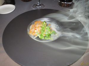 Ricciola del Pacifico servita con insalata crescione e affumicata istantaneamente sotto cupola di vetro