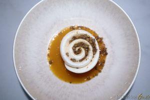 Il dessert: Bavarese alla vaniglia, con pistacchio sabbiato con fondo di papaya e passion fruit