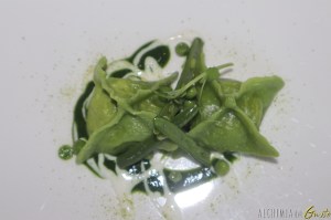 Raviolo d’ortica fatto in casa ripieno di orata al cartoccio e ricotta salata accompagnati da una salsa di erbette e fagiolini.