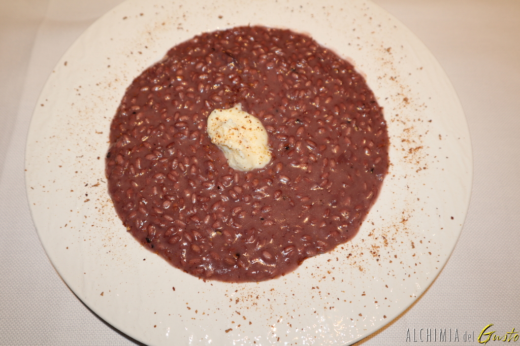 Risotto al vino Amarone della Valpolicella, mantecato con burro, parmigiano e monte veronese stagionato, servito con polvere di cipolla rossa, mousse al formaggio e croccante di riso al vino