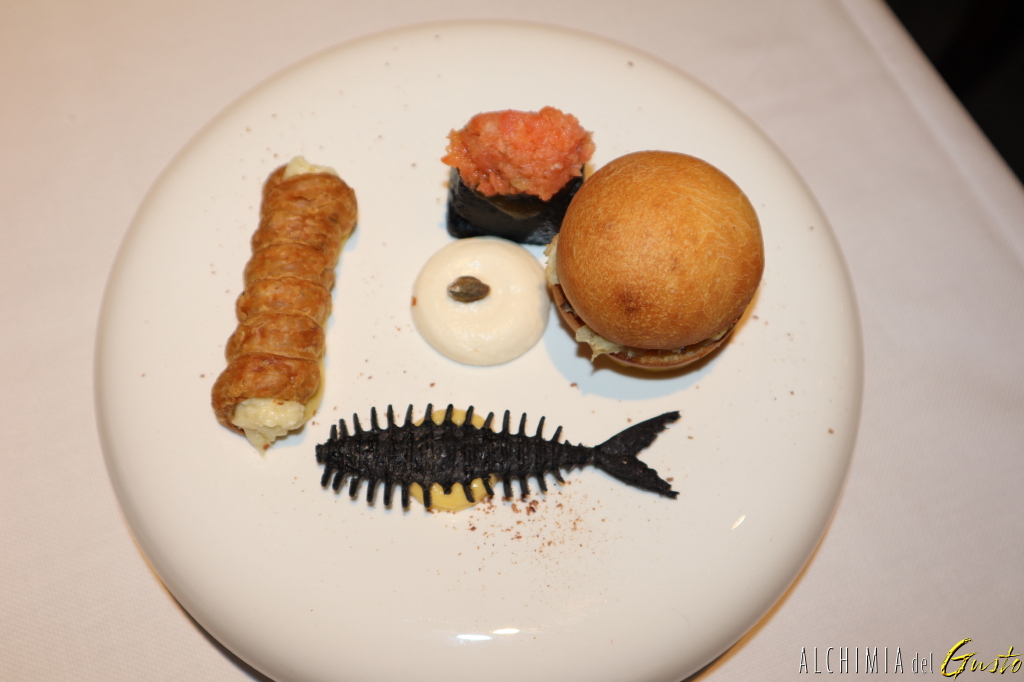 TRE CICCHETTI DI PESCE ALLA VENEZIANA: panino morbido con luccio in saor, trota marinata agli agrumi con polenta al nero di seppia e mscarpone salato , cannolo di baccalà alla veronese