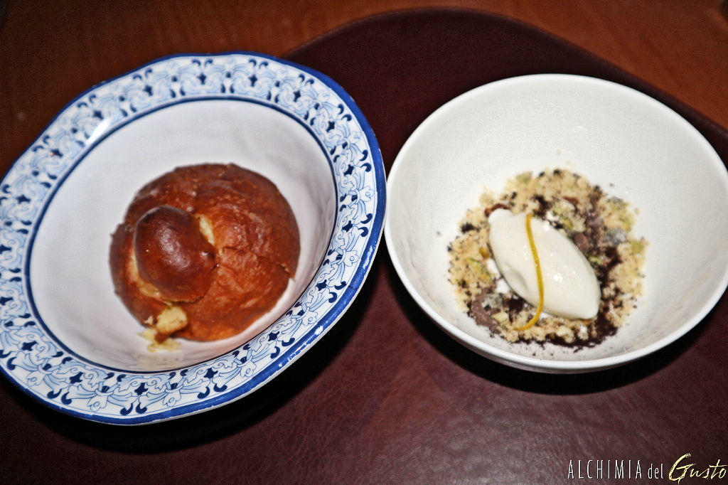 Sicilia: Crumble di mandorle e pistacchio, polvere di caffè e cioccolato di Modica, sorbetto di granita al limone e brioche col tuppo