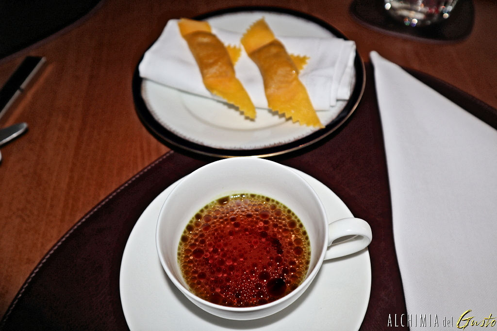 Tortello di zucca mantovana con mostarda di pere siciliane, Facci Bedda, da mangiare con le mani accompagnata da una tisana di verdure alle erbe ed olio di semi di zucca