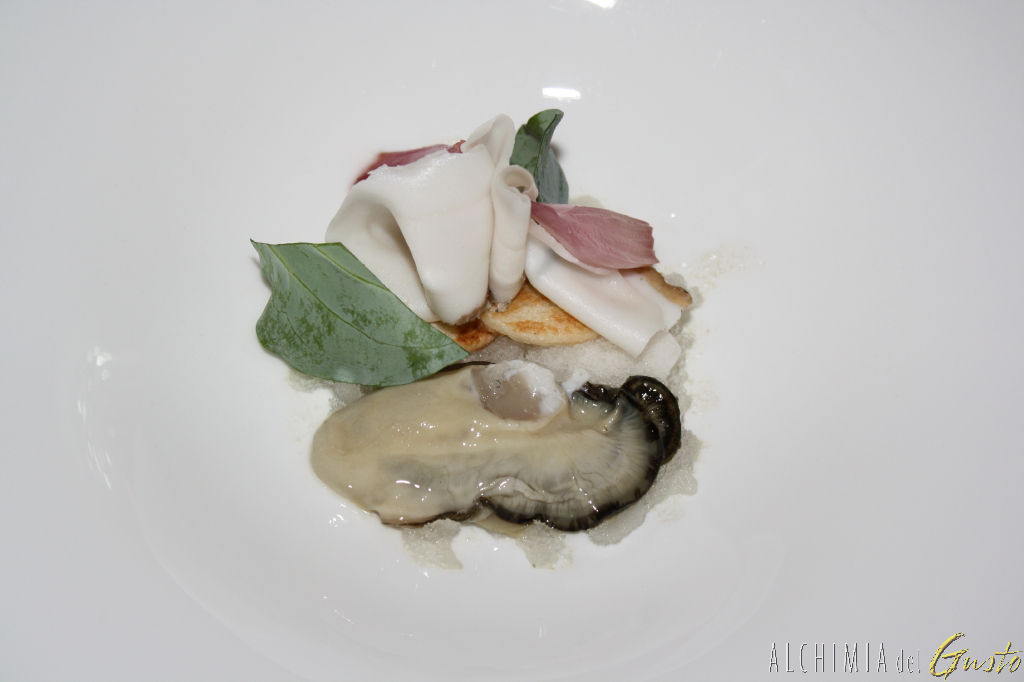 Ostrica, scalogno in agro, acqua di mare ghiacciata e lardo