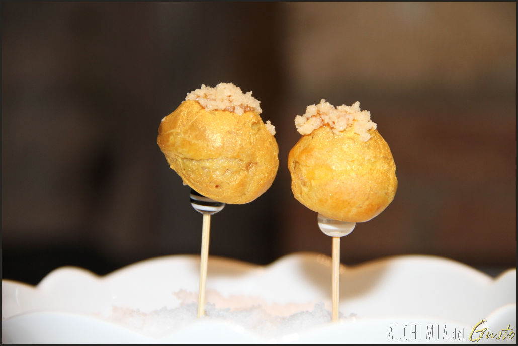 Bigne avvolto nell’oro farcito ricotta affumicata e caramello pomodoro