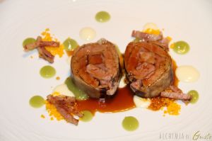 Controfiletto di agnello farcito di foie gras con bacon torlo d’uovo riduzione di panna e salsa di asparagi