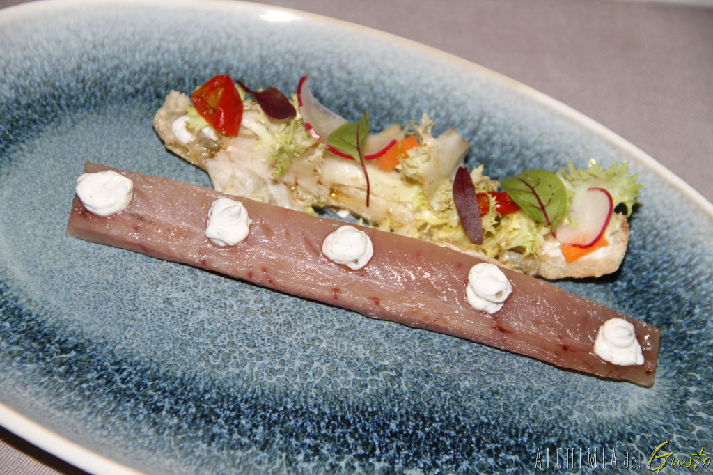 Palamita marinata con yogurt ai capperi, bruschetta ed insalatina mediterranea