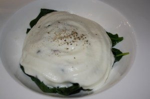 Uovo pochè spuma di parmigiano, spinacino e croccante
