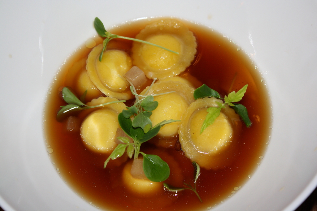 Ravioli ripieni di parmigiano reggiano e foie gras con brodo di manzo profumato all’orientale.