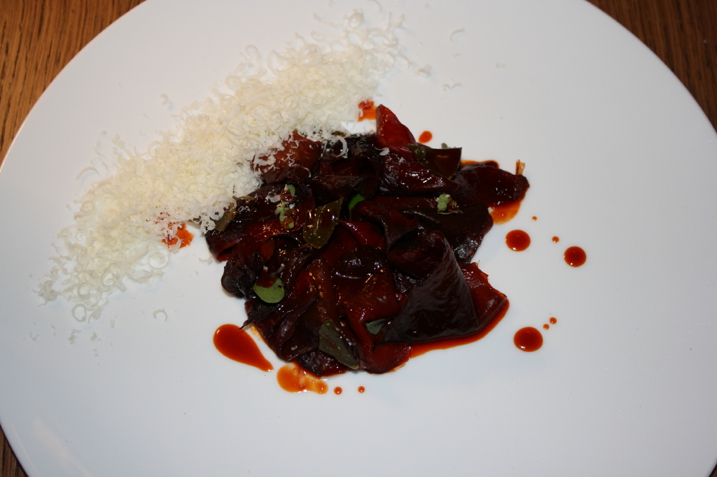 Finti straccetti di manzo, (Peperone trattato per somigliare sia nel colore che nella consistenza per assomigliare al manzo), crema di ricola e parmigiano reggiano.