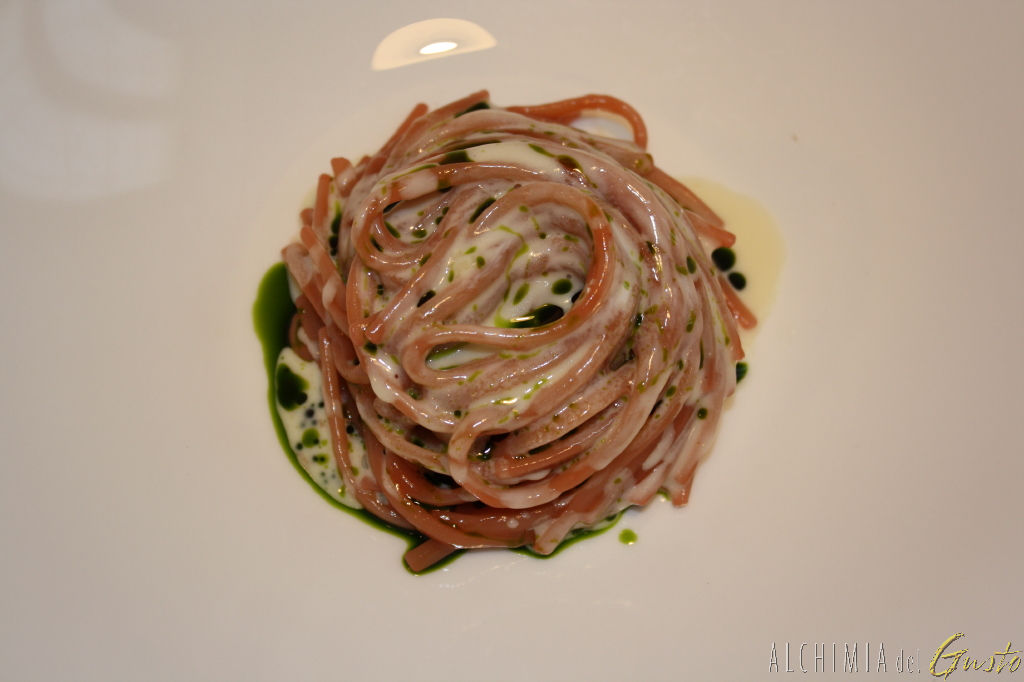 Linguine “pastificio Felicetti” al non pomodoro con salsa di prugne fermentata
