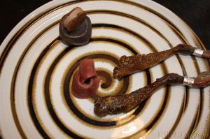 Coscetta glassata cosparsa di un mix di spezie mediorientali e uno spiedino di cuore e fegato leggermente scottati