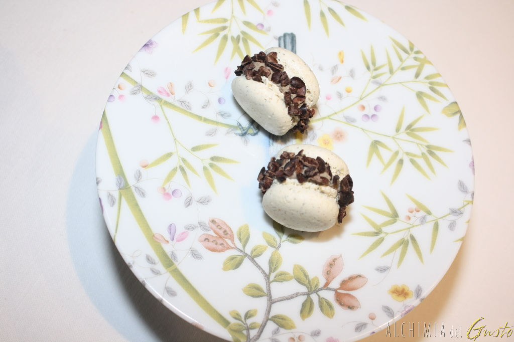 Macarons salvia e rosmarino e fegatini di piccione e fave di cacao