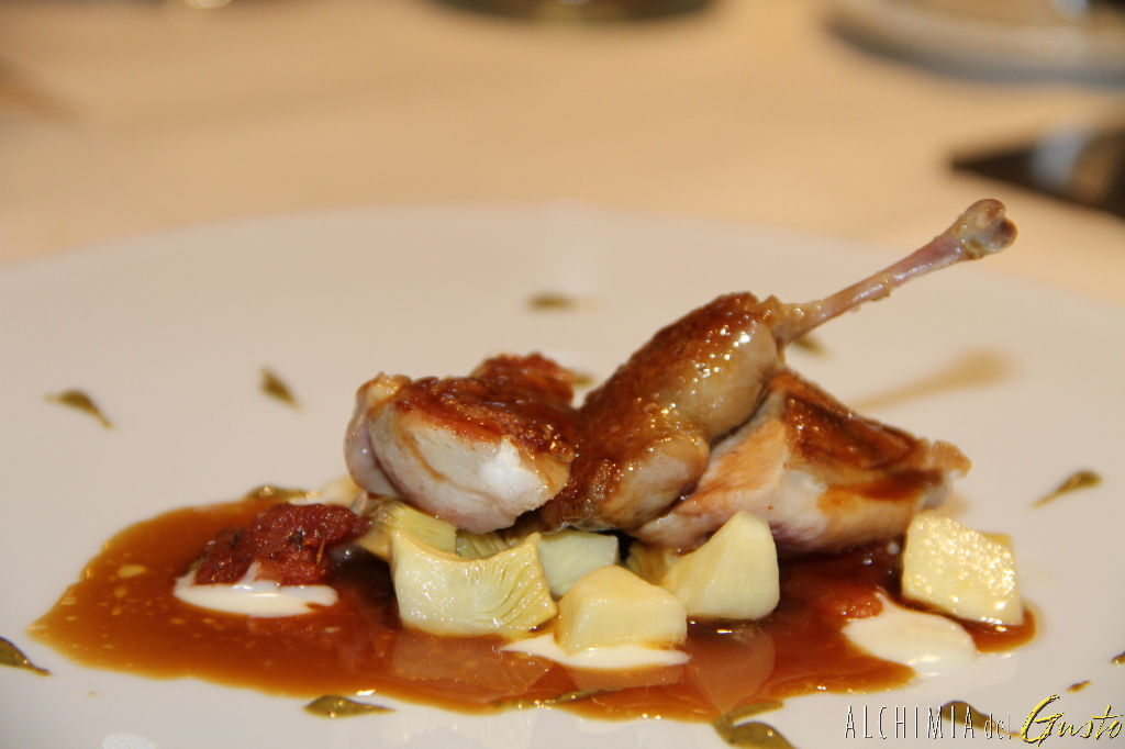 La quaglia leggermente affumicata su carciofi croccanti pomodoro confit crema di grana padano e pistacchi