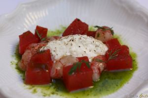 Pomodoro fiorentino, gamberi rossi siciliani, cocomero e burrata