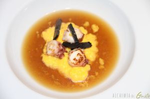Uovo strapazzato con porro polpo arrostito, tartufo nero e daci (brodo di tonno)